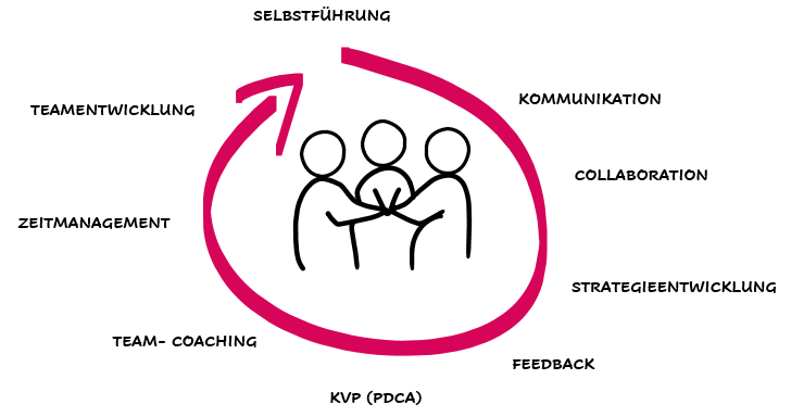 - Organisationale Fähigkeiten entwickeln und Mitarbeiter:innen für die Veränderung gewinnen und aktiv bei der Performancesteuerung unterstützen